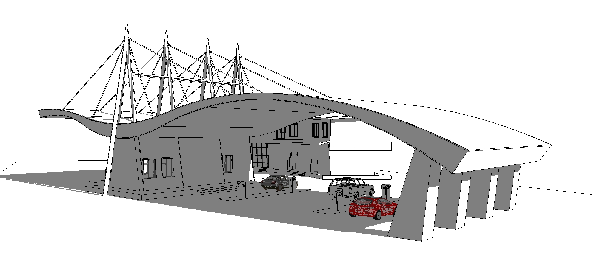 پمپ بنزین و گازوئیل یکی از اصلی ترین خدمات بین راهی با سطح اشغال ۲۰۰۰ مترمربع نیز بصورت فرمال با سازه کششی و در هماهنگی با ساختمان اصلی طراحی گردیده است.