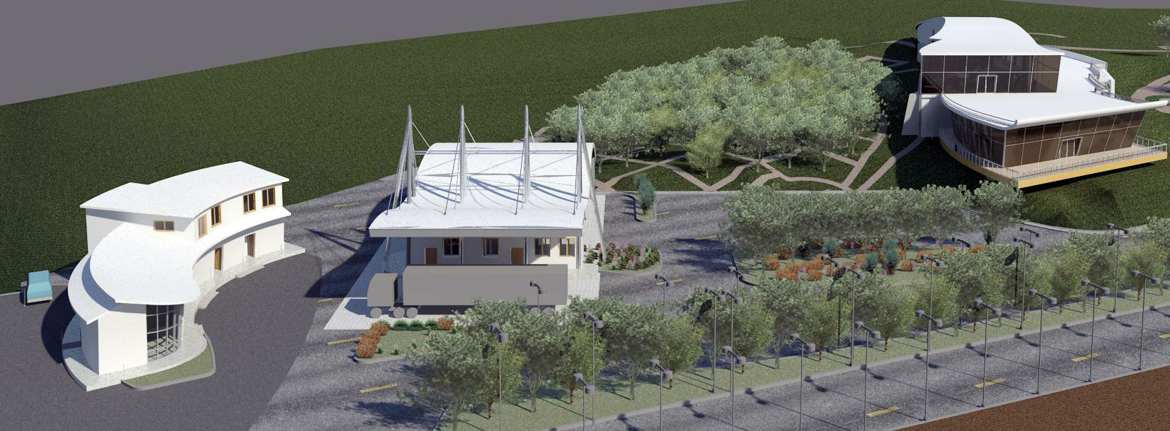 ساختمان اصلی به متراژ ۲۵۰۰ مترمربع بعنوان ساختمان خدماتی بصورت فرمال و سیال طراحی شده است. ترکیب با طبیعت، مشخصا با شیب زمین، حرکت آب (چشمه طبیعی)، فضای سبز (درختان انجیر کهنسال) فرم سیال و متحرک و استفاده از بام سبز از ویژگی های این ساختمان می باشد.
